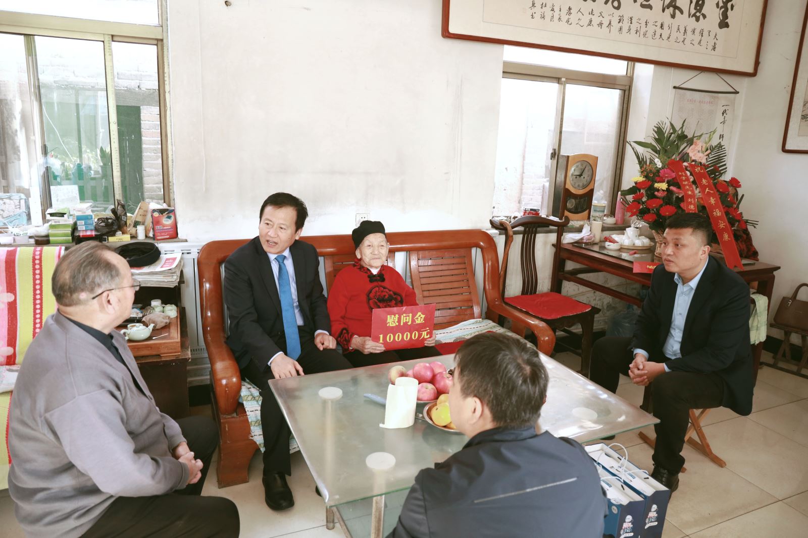 在罗村村100岁老人蒲文兰和大王村104岁老人于福美的家中,刘子斌董事长分别向老人们送上了慰问金和慰问品,并同老人和亲属进行了亲切交谈,详细询问老人的生活起居、健康状况、医疗保障等相关情况。董事长表示,希望通过自身的努力,让更多的老年人享受社会发展的成果和社会大家庭的和谐温暖。