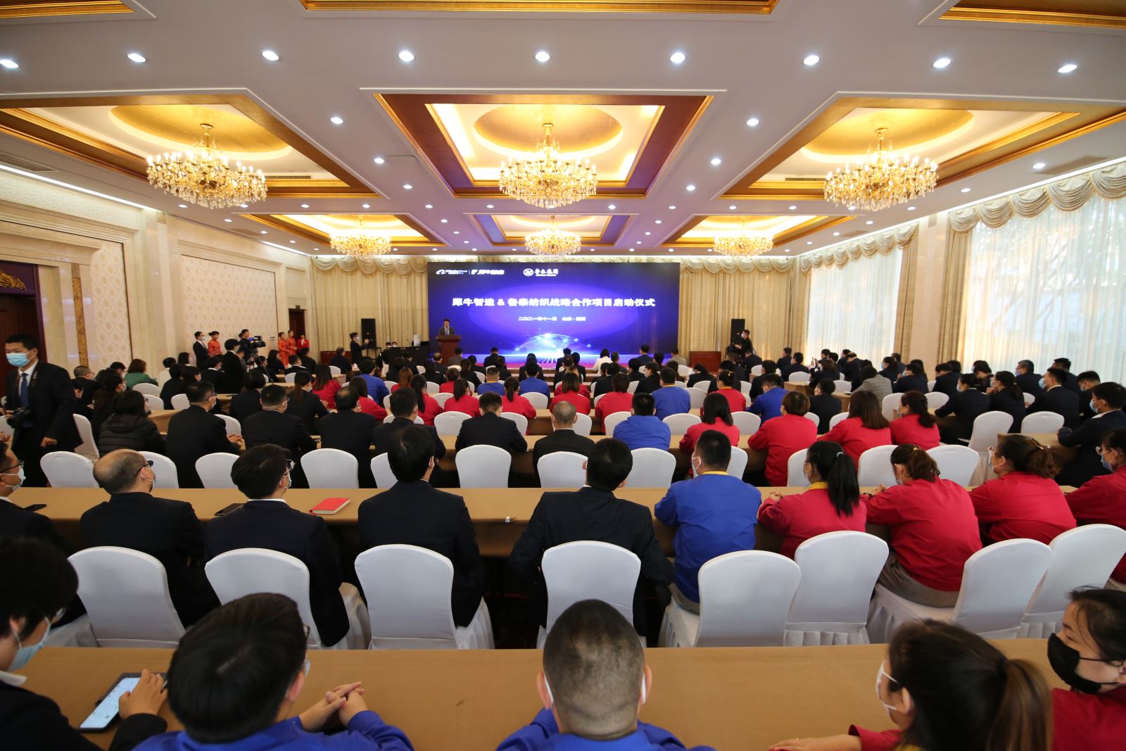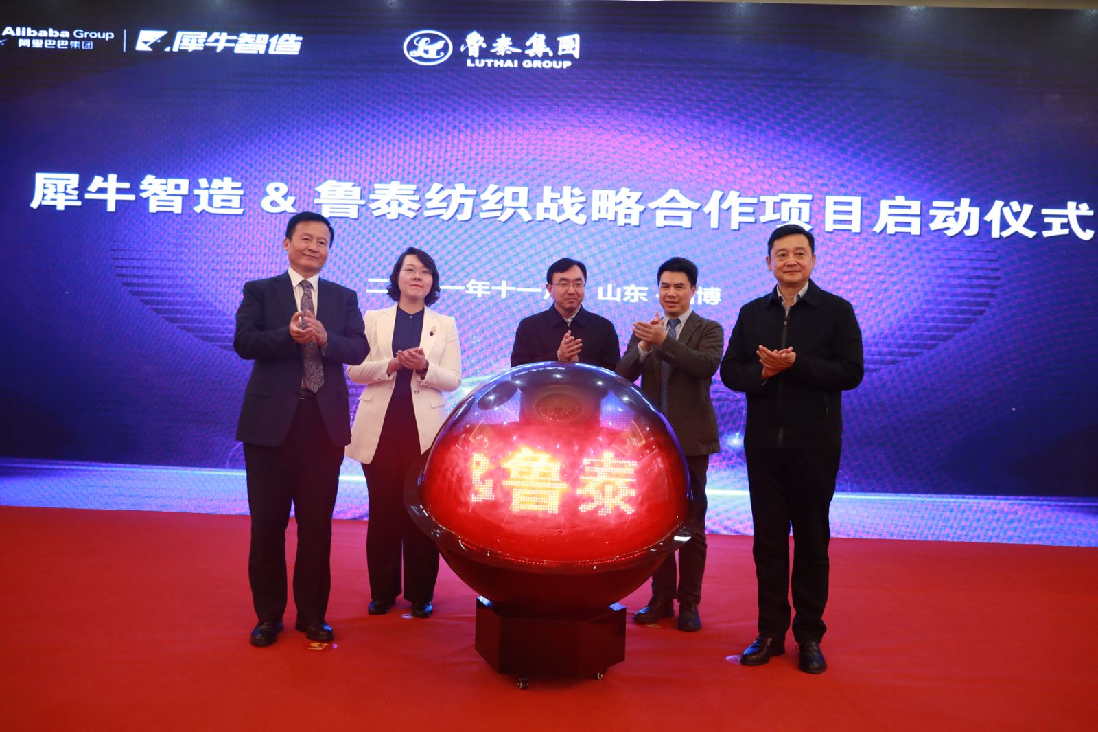 11月1日,犀牛智造&鲁泰纺织战略合作项目启动仪式在公司般阳山庄举行,犀牛智造CEO伍学刚等犀牛智造相关负责人,市工信局党组副书记、副局长于明磊,区委书记田兵兵,区委副书记、区长周婷,区委常委、办公室主任刘鸿智,区政府办公室主任刘鹏飞,区工信局局长付志欣等市区领导,公司党委书记、董事长、总裁刘子斌等公司领导出席启动仪式。区委常委、副区长郭亦华主持仪式。