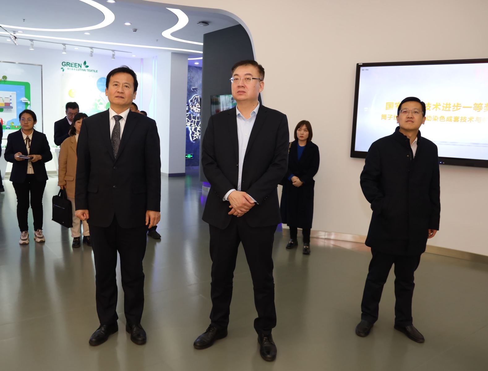 会前,刘子斌董事长陪同调研组一行参观了鲁泰面料馆,并详细介绍了公司的海外布局、中水回用、科研创新等方面的情况。