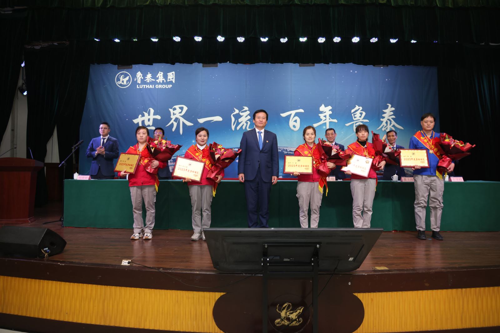 公司工会主席董士冰宣读《关于表彰2023年度“先进集体”“劳动模范”和“标兵”的决定》。决定授予纱线生产管理部纺纱一厂运转班乙班等41个单位鲁泰集团2023年度“先进集体”,颁发荣誉奖牌,并向“先进集体”成员每人颁发纪念品一份;授予刘霞等9名员工鲁泰集团2023年度“劳动模范”,颁发荣誉奖牌,每人颁发奖金10000元及奖品;授予孙宝山等112名员工鲁泰集团2023年度“标兵”,颁发荣誉证书,每人颁发奖金2000元。
