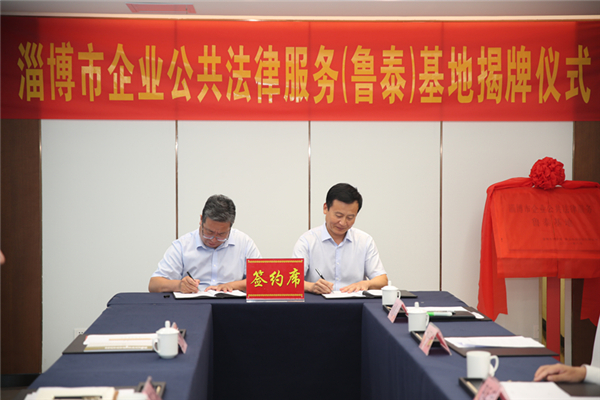 仪式上,聂玉彬局长、田兵兵书记共同为“淄博市企业公共法律服务(鲁泰)基地”揭牌;王彬副局长与刘子斌董事长签订了共建企业公共法律服务基地合作协议。